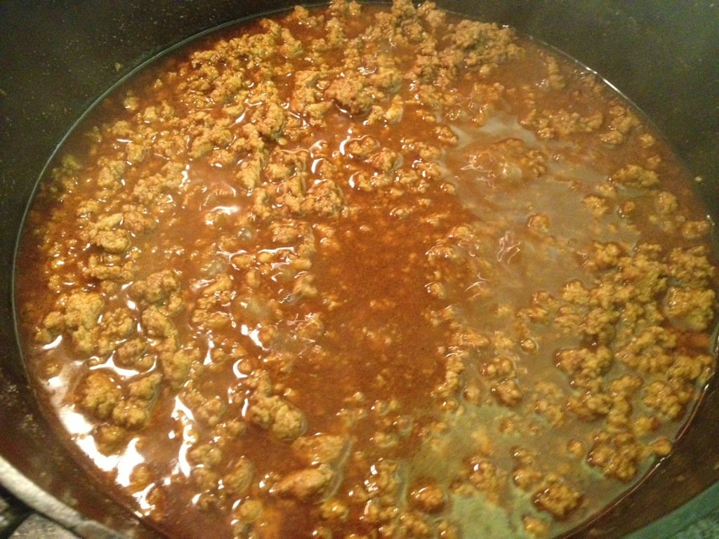 Brown the meat in the bottom of a large pot using a couple tablespoons of olive oil. Add the tomato sauce, beef broth, and Tabasco sauce and stir well. Add the rest of the ingredients from part 1: Onion powder, red pepper, beef bouillon, and chicken bouillon. Stir until well mixed and bring to a boil. Reduce heat until the mixture is at a medium boil (or a strong simmer, if you prefer to think of it that way) and cook uncovered for 45 minutes, adding water as necessary. When is “necessary”? Well, if there are dry bits of meat protruding well above the surface of the liquid, you need to add water. If there aren’t, you don’t. If you need to stretch out your cooking time a bit (say, if your dinner guests are running late), it won’t hurt a thing to simmer the mixture in this state for an hour or even two.