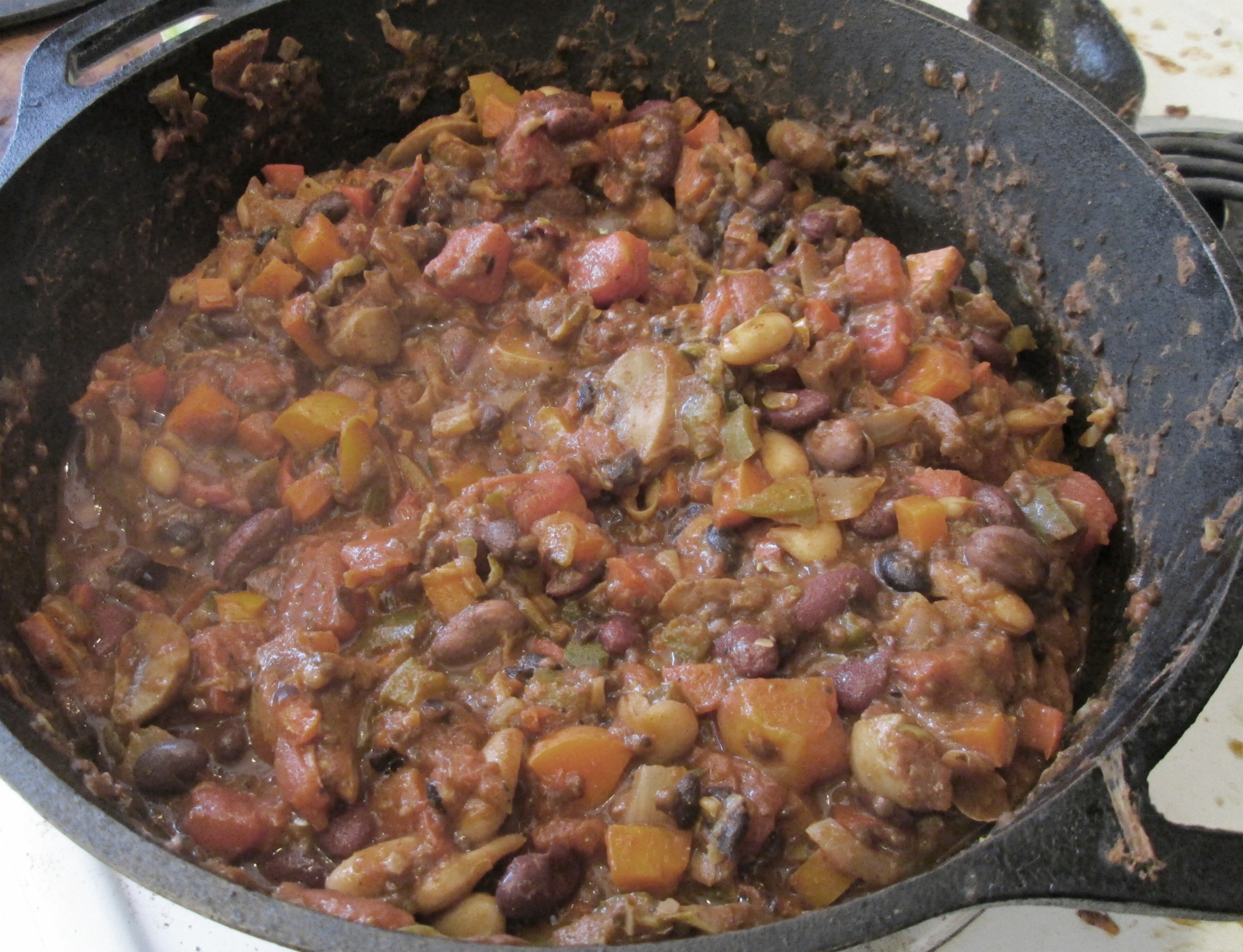 When you are within half an hour of dinnertime, add all of the ingredients from part 2: Garlic powder, cumin, white pepper, and chili powder. Stir well, cover, and simmer for 30 minutes. At the end of the 30 minutes, salt to taste and remove from heat. Serve with grated cheddar cheese (I like Tillamook sharp), chopped white onion, and pinto beans. It’s also great over pasta, on hot dogs, with Fritos… Heck, I’ve even thought about brushing my teeth with this stuff. Just remember, put the veggies in a salad bowl and let the awesome simplicity of this chili speak for itself. Welcome to the big leagues.