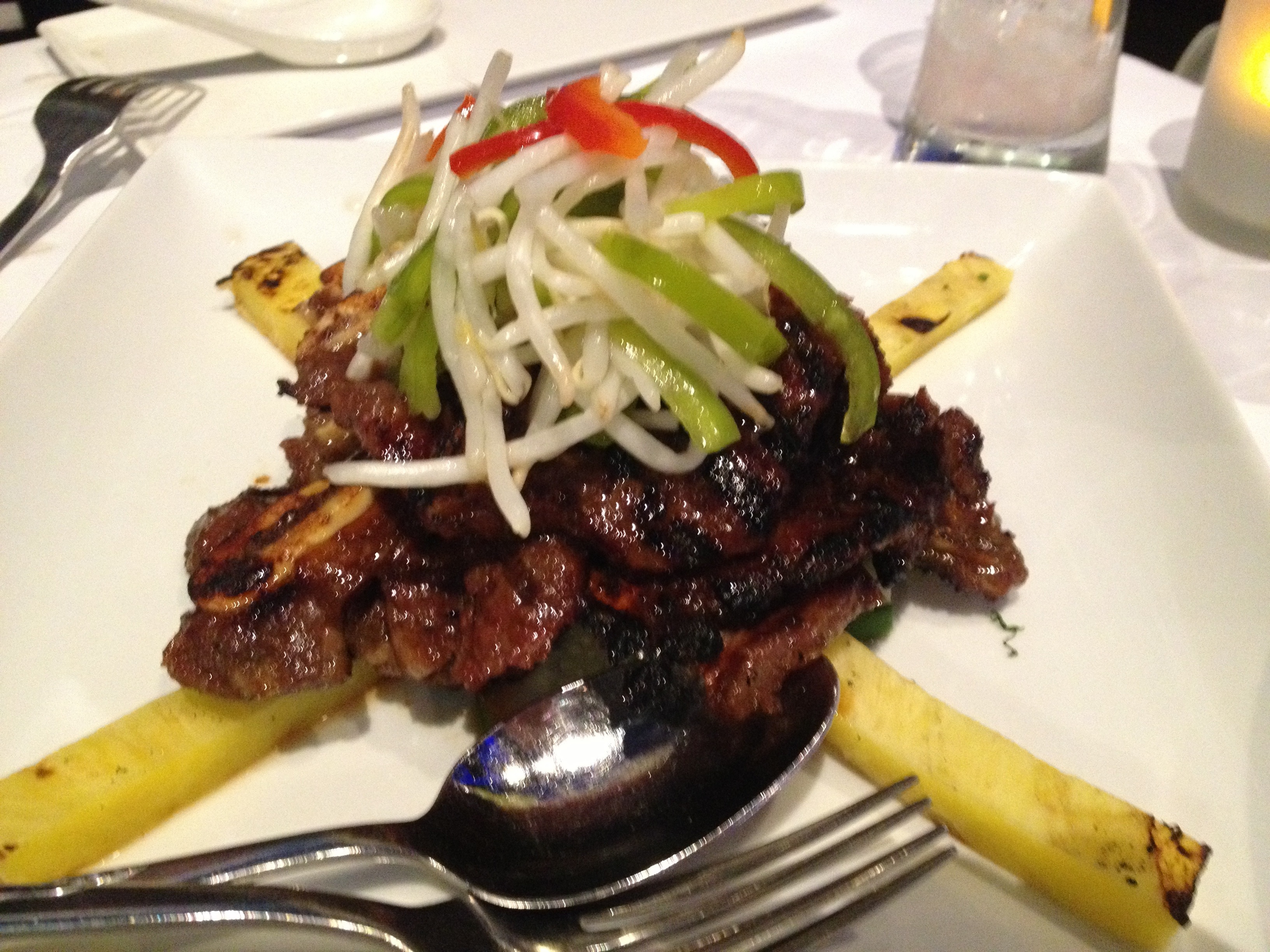 Next up were the short ribs, and they smelled great. Curiously, a spoon was provided. A spoon? I can think of a dozen different ways to eat ribs, and exactly zero of them involve the use of a spoon. Come to think of it, that was the same story with the colossal prawns on our last visit – they came with an utterly useless spoon. Seriously, why? It’s like trying to eat spaghetti with a rubber mallet and a football.