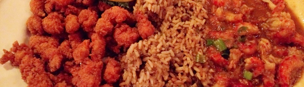 For the sake of my fellow clueless Californians, I’ll explain what crawfish are. They’re small freshwater lobsters with a flavor similar to both prawns and saltwater lobsters, but as far as I’m concerned superior to both. They are less rubbery than regular lobster and more flavorful than prawns – a perfect balance. Pappadeaux prepares their crawfish a few different ways, but my favorites are fried and étouffée. Both of these appear on their “Crawfish Platter” along with a heap of dirty rice. Bingo.