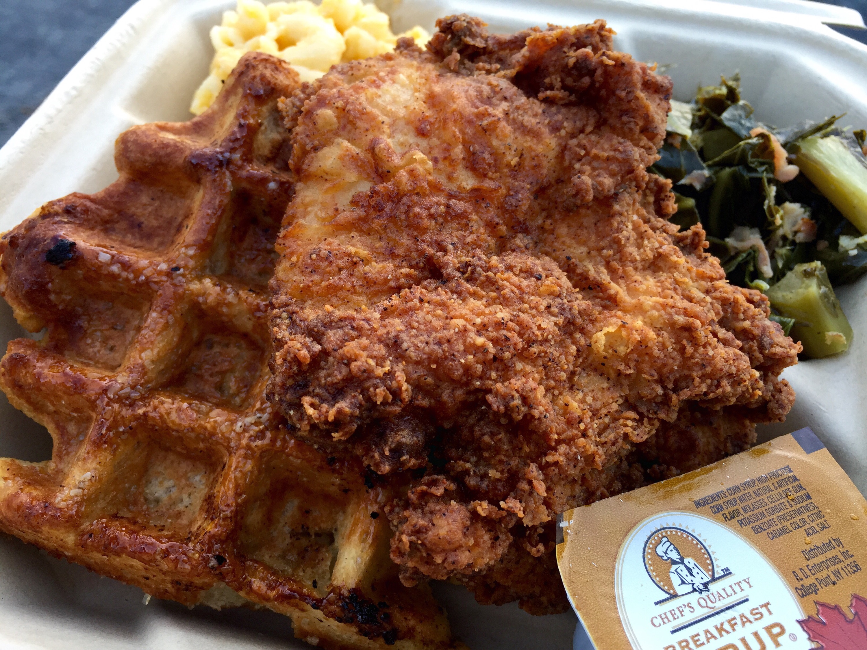 I made my way over to this particularly-easy-to-spot-in-a-crowd truck and ordered the 2 Legit, which includes four unique and delicious foods: fried chicken, a waffle, mac and cheese, and collard greens. The boneless white meat fried chicken was darn near perfect and had a wonderful, flavorful crust on it. It was perhaps just the tiniest bit dry, but I still give it high marks. The waffle surprised me; it wasn’t the typical fluffy Bisquik style thing you’d expect, but rather a satisfying, whole-wheat-ish masterpiece with a wonderful crunch. It was excellent.