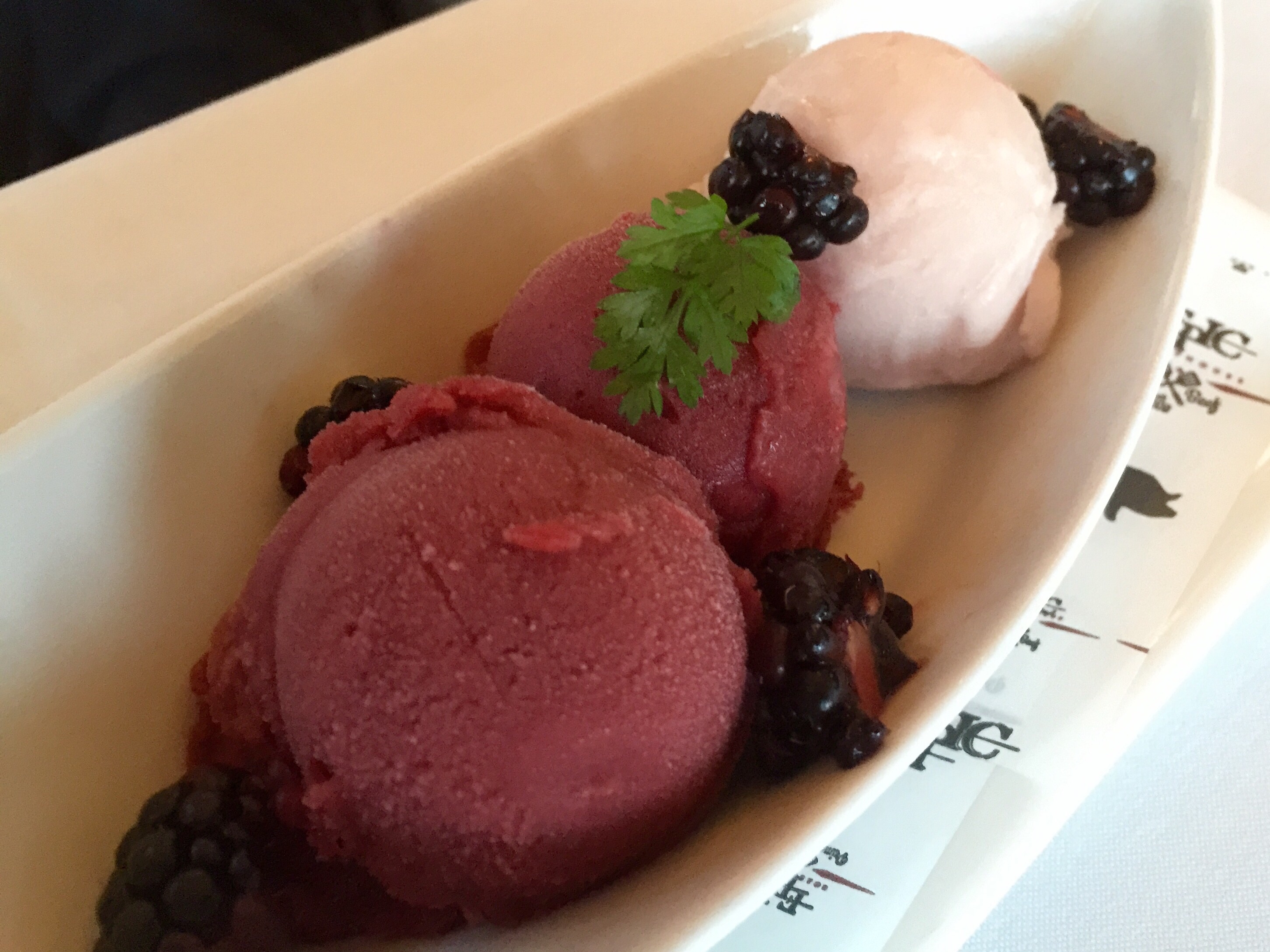 A trio of sorbets also made an appearance at our table. The flavors were cala orange, blackberry, and banana. Those same flavors represented in intensity by font size were cara cara orange, blackberry, and BANANA. The orange was light, the blackberry was light and refreshing, and the banana was IN YOUR FACE and was at least ten times more potent than the other two. The orange and blackberry seemed downright watery after tasting the banana, but they actually worked quite well as a trio.
